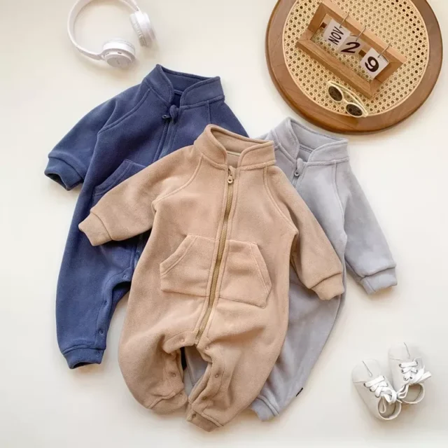Crafted from high-quality fleece, this romper is both soft and breathable, making it perfect for sensitive newborn skin. The full-length sleeves and zipper closure make it easy to put on and take off, while the O-neck design ensures maximum comfort. Available in sizes suitable for babies from 0 to 24 months, this romper is designed to fit your growing baby perfectly. The solid color and unisex design make it a stylish and practical choice for any baby’s wardrobe.